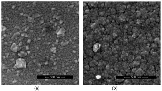 WO3 films deposited in vacuum at room temperature have a metallic shine, which confirms the fact that the absence of an oxygen atmosphere does not allow the formation of stoichiometric tungsten oxide. The WO3 films deposited in an oxygen atmosphere have a thickness of about 620 nm, which is measured in section by SEM. In 150 mTorr oxygen or more, at a flow of 1 sccm, the WO3 layer is transparent, which indicates the presence of stoichiometric oxide and is confirmed by XRD. SEM results indicate the dependence of the film morphology on the deposition temperature and oxygen pressure. At relatively high deposition pressures of 500 mTorr O2, the films consist of loosely packed agglomerations of nanoparticles for both 300 °C and 600 °C (Figure 1). The difference between the two temperatures at this pressure is that the nanoparticle agglomerations visible in SEM images appear to be larger at 300 °C than at 600 °C. However, the films are porous at both temperatures and this leads to similarities in their sensing properties, which will be discussed later.