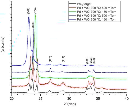 XRD patterns of the WO3 target and the Pd/WO3 sensitive films deposited in various temperature and pressure conditions.