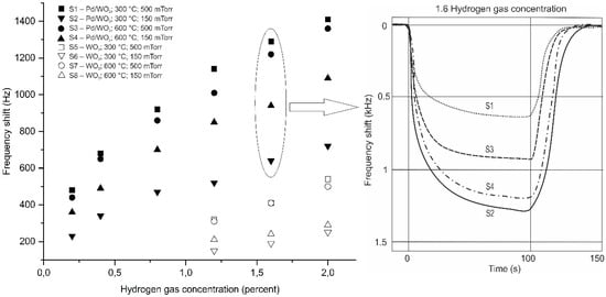 (left) Frequency shifts of the WO3–based sensors (open symbols) and Pd/WO3-based sensors (closed symbols) for various hydrogen gas concentrations. (right) Example of Pd/WO3 sensor response towards 1.6% H2 gas concentration at RT.