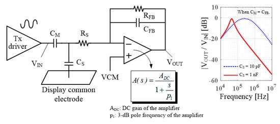 Numerous touch sensing integrated circuits (ICs) use a charge amplifier (CA) in the first stage of the analog front-end (AFE) because of its excellent noise immunity [,]. They are designed to have the transfer characteristics of a band-pass filter (BPF) with a maximum transfer gain at several hundred kilohertz to block low-frequency noises from power supplies, lamps, and chargers. However, an increase in the display’s coupling capacitance decreases the upper cut-off frequency of the BPF, which moves the passband of the circuit to low frequencies.