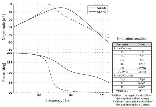 where , ADC2 and p2 stand for the DC gain and the 3-dB pole frequency of the amplifier inside the proposed NC circuit, respectively. Equation (1) confirms that in the low-frequency region, the NC circuit has a negative capacitance of −CNC0 × (R2/R1). For reference, this value is equal to the negative value of the product of the Miller gain (AM = R2/R1) and the base feedback capacitance (CNC0). However, the phase of the NC circuit moves away from 270° above a certain frequency, as shown in Figure 5.