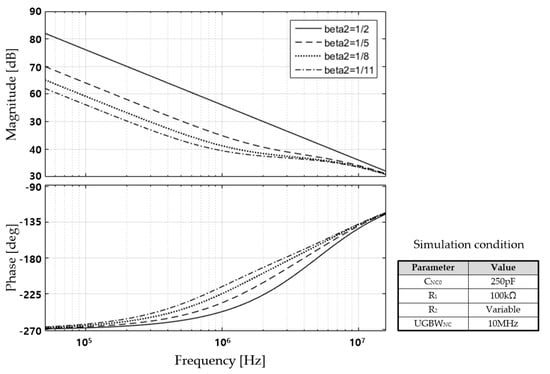 In this figure, we can find that the frequency at which the phase shift occurs decreases as the Miller gain increases or the β2 value of the NC circuit decreases. This is because the closed loop bandwidth of the NC circuit decreases as the Miller gain increases. Therefore, using a small CNC0 and an excessively large Miller gain to obtain a certain NC value is undesirable in terms of the decrease in the valid region of the NC. In contrast, using a large CNC0 and small Miller gain is advantageous for a low-power circuit design, but this combination can increase the chip size. Therefore, it is important to select the appropriate Miller gain considering the product cost.