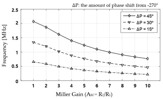 As for the selection of the feedback gain, because the RHP pole and LHP zero move in the same direction based on the change in the value of β2, we simulated a change in the valid region of the NC. When setting the NC value, because the Miller gain rather than the feedback gain provides direct intuition in the circuit analysis and β2 is equal to 1/(1 − AM), the Miller gain is used as an independent variable in the result plot. Figure 7 plots the relationship between the frequency with 15°, 30°, and 45° phase shifts from the ideal negative capacitance and the Miller gain of the NC circuit.