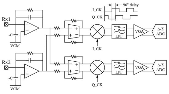 The demodulated signal is passed through a 2nd-order LPF to remove the high-frequency components of the demodulated signal and other high-frequency noise components. It is then amplified by a variable gain amplifier (VGA) to minimize the SNR reduction due to the quantization noise in the ADC. Finally, the analog signal is converted to digital code by a 2nd-order incremental Δ-Σ ADC [,].
