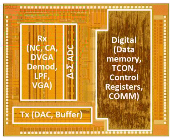 The test chip shown in Figure 10 was implemented using a 0.35 µm 1P4M-CMOS process. It consisted of analog signal processing circuits and Δ-Σ ADCs that could support up to 10 Rx channels, along with various digital circuits, such as those for the data memory, timing controller, control registers, chip-to-chip communication interface circuits, and 15 Tx drivers. The entire Tx and Rx occupy 1.12 mm2 and 3.78 mm2 respectively. The area of the ADC block is 0.9 mm2, and the digital blocks with data memory, timing controller, and registers occupy 5.62 mm2.