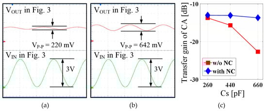 We examined the effect of the proposed NC compensation by comparing the outputs with and without the compensation at the CA stage. For comparison, we constructed a test circuit with the same configuration as the equivalent circuit model of the TSP shown in Figure 2. The Tx blocks drove one node of the mutual capacitance with a sine wave that had a peak-to-peak voltage of 3 V and frequency of 200 kHz, and the CA output signals were measured while changing the capacitance corresponding to the display coupling capacitance to various values. As shown in the two measurement results on the left side of Figure 11, when the NC compensation was absent, the CA output had a peak-to-peak voltage of 220 mV, whereas when it was compensated using NC, the output increased approximately three-fold to 642 mV. In addition, Figure 11c shows that the gain of the CA is not substantially reduced even though Cs increases. This result confirmed that the touch performance could be improved using a high-frequency touch signal even in a TSP with a large display coupling capacitance if an NC corresponding to the display coupling capacitance was generated using the proposed NC circuit.