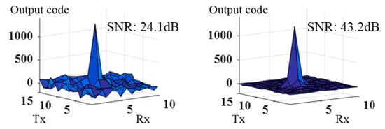 Next, we compared the ADC outputs to evaluate the SNR of the touch signal on the test chip. In this test, the test chip was connected to a TSP that had 15 Tx and 10 Rx sensor electrodes, and its display coupling capacitance per Rx channel was approximately 660 pF. Figure 12 shows the 2D touch data measured with and without the NC compensation. The VGA outputs were adjusted to be the same in both cases to ensure the same quantization noise for the ADC. We calculated the signal-to-noise ratio (SNR) using Equation (5) []: