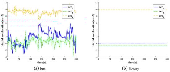 Through the analysis of the data set, we can distinguish the dynamic environment from the static scene only based on the value of the acceleration sensor. As shown in Figure 1, in the static scenes of libraries, the values of a triaxial acceleration sensor are basically stable, while in the dynamic scenes of buses, the sensor values change drastically. Therefore, the dynamic and static scenes can be distinguished by calculating the values of standard deviation of the triaxial acceleration sensor values.