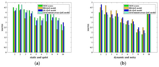 Ten groups of MOS score results in different environments. (a) Static and quiet environment. (b) Dynamic and noisy environment.