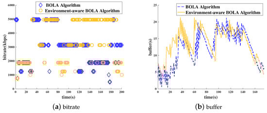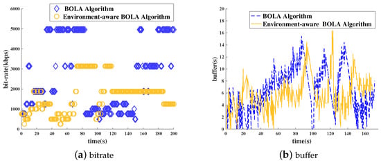 Figure 6 shows the experimental results when the user is sitting on the bus or walking on campus. These environments are basically dynamic and noisy. Figure 6a shows the results of the requested bit rate in these environments. It can be seen that the environment-aware BOLA algorithm is more gentle at the requested bit rate level. In this time, the bit rate levels is lower than the BOLA algorithm. However, from the results in Figure 6b, it is clear that the length of stallings is reduced obviously.