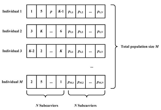 Here, for convenience, we represent each solution individual in the population with a matrix of size , in which the first N elements are in the range of , indicating how the N subcarriers are assigned to the K users. The next N elements represent the specific power values allocated to each subcarrier. According to Equations (5) and (6), these variables should be in the range of and . Then, the structure of the population can be depicted as in Figure 1.