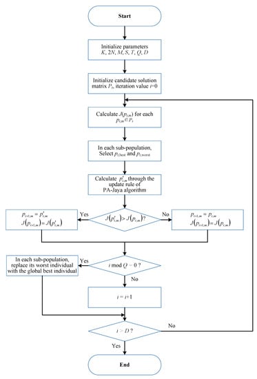 In order to verify the performance of our proposed solution method using the PA-Jaya algorithm, the simulation model was run 10 times under the same parameter settings, and the average value was obtained. Moreover, the computational performance was also compared between our solution method and other popular algorithms, including SA [], GA [], PSO [,], DE [], ICO [], and traditional Jaya []. The detailed parameter settings for each algorithm can be found in Table 2. It is noted that for our proposed PA-Jaya algorithm, the initial population is randomly generated, and each subpopulation is updated by asynchronous Jaya iteration, as shown in Algorithm 2. Then, information exchange between different subpopulations takes place at regular intervals, and the overall process can be seen in Algorithm 3.