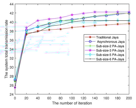We first compare the results of our proposed PA-Jaya algorithm in different subpopulation size cases with the asynchronous Jaya and traditional Jaya algorithms. When the total transmit power ( = 1 W) and the BER ( = 5 dB) are limited (which means that the model constraints are satisfied), and the maximum number of iterations D is reached, the results of different algorithms are as shown in Figure 3.