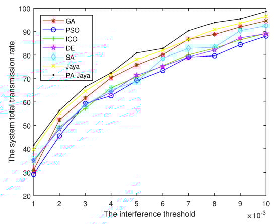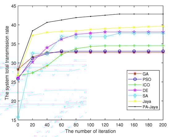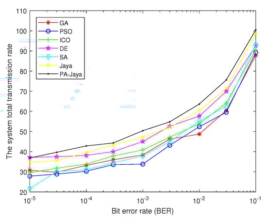 Moreover, as shown in Figure 5, with the lower BER required by the system, the constraint requirements decrease, so the total system transmission rate increases. It also indicates that the system can effectively adapt to different BER constraints in the power allocation model. For the same reason, the solution performance of our PA-Jaya algorithm is also better than those of SA, GA, PSO, DE, ICO, and the traditional Jaya algorithms.