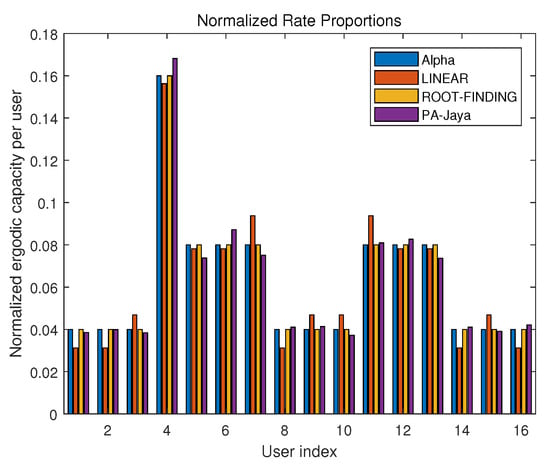 Subsequently, with the same settings for the simulation parameters, we used the proposed PA-Jaya algorithm to solve the multi-user OFDM CRN problem with the user proportional rate constraints mentioned in Section 2.2. Here, the interference generated by the secondary users to the primary users is ignored, and the proportional rate between different users is randomly generated. We set the number of secondary users as 16, with the purpose of better comparing the result of our PA-Jaya algorithm and others in the case of a large number of secondary users, which is slightly different from the former simulation setup. In Figure 7, the comparison is clearly shown, where “Alpha” indicates the user proportionality factor required in this model. Figure 8 and Figure 9 show the comparison of these different algorithms in the user fairness indicator and channel capacity with different user numbers, respectively.