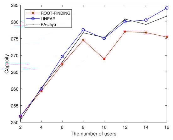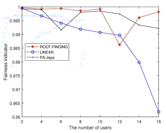 Moreover, for the user fairness issue discussed in this article, the user fairness proportion factor is randomly generated. Then, we compare our proposed PA-Jaya algorithm with the algorithms ROOT-FINDING [] and LINEAR []. Our solution to this issue can be divided into two parts. The first part is the allocation of subchannels, which is the same as that in Ref. []. In the second part, we use the PA-Jaya algorithm to allocate the appropriate power to the channels of different users while meeting the required constraints. As the fitness function is set as Equation (17), and the minimum user rate proportionality is set to 0.99, the process of conducting PA-Jaya and setting the parameters are consistent with the former issue.