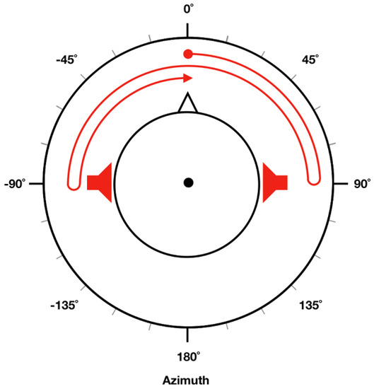 Spatially moving sound stimuli presented in the experiments were generated using MATLAB R2016b (MathWorks, Natick, MA, USA). We first generated pure-tone sound signals with corresponding frequency and intensity (referred to as “target intensity” in this study) for each trial. In Figure 1, trajectory of the moving sound is illustrated as a red arrow, where the sound source started from a position straight in front of the head (0° azimuth) and then moved toward the right side (right ear, 90° azimuth). It then turned back and moved toward the left side (left ear, −90° azimuth). Finally, it returned to the original position and repeated this circle. To make participants feel that the sound source was actually moving, different intensities of pure-tone sound stimuli were given to the left and right ear [26] depending on the current location of the sound source. When the sound source was located in front of the head, a pure tone 10 dB lower than target intensity was presented to both ears. When it was located in the right ear (90° azimuth), a pure tone at target intensity was presented only to the right ear (no sound presented in the left ear). When it was located in the left ear (−90° azimuth), a pure tone at target intensity was presented only to the left ear (no sound was presented in the right ear). To create a continuously moving pure-tone stimuli, we evenly divided a 90° segment (either 0° to 90° or −90° to 0°) into six sub-segments by placing five points between either 0° and 90°, or −90° and 0°. Different sound intensity (in dBA) levels were given to each ear based on the current (virtual) location of the sound source, which could be readily evaluated using a linear interpolation of sound intensities at 0°, 90°, and −90°. In our experiment, each circle (0° → 90° → −90° → 0°) lasted for 3 s; namely, stimuli moved at a frequency of 1/3 Hz. Therefore, a cycle was repeated twice during each 6-s EOG recording trial.