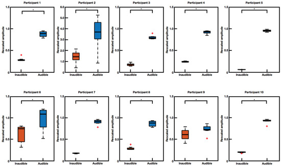 Box plots of rescaled (normalized) amplitudes for inaudible and audible conditions. Wilcoxon signed rank test showed a statistically significant difference between two conditions—inaudible and audible conditions—in all subjects (Bonferroni corrected p < 0.05, marked as *). Note that box plots for participant two have different scaling ranges.