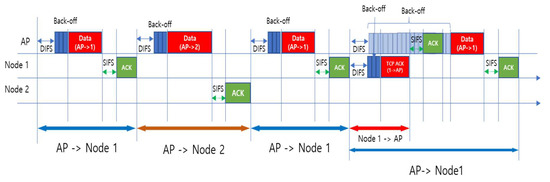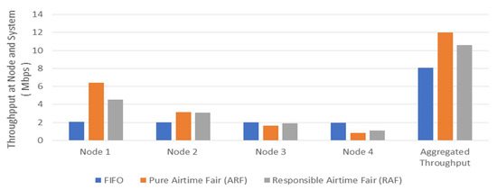 Conceptually, fairness based on responsible airtime can be addressed as usual. For example, the responsible times of each node are measured, and Jain’s Index [14] of them may be calculated to evaluate fairness. However, we believe that, unlike pure airtime, the actual responsible airtime of a node is difficult to measure or analyze from a scheduling result. The exact amount of responsible airtime of a frame, which is necessary for airtime fair scheduling, also seems to be not easy to calculate with its data length and data rate. Instead of making a complicated analysis, this study uses responsible airtime as a conceptual scale only. In practice, fairness is indirectly addressed via throughput, as shown in Figure 2.