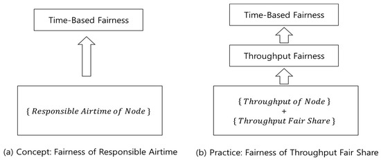 Equation (5) says that the fairness of responsible airtimes can be determined via the fairness of throughputs, or, more precisely, the fairness of the throughput achieving ratios. This is our practical approach, as illustrated in Figure 2b.