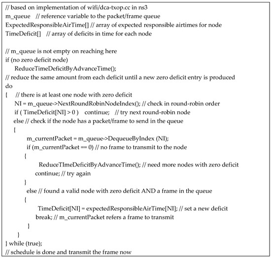 Figure 3 shows our scheduling algorithm in detail. The code is based on the implementation of the ns3 [25] wifi module; it is inserted into the scheduler part in dca-txop.cc. As the ns3 variable, m_queue refers the queue of frames to transmit, and m_currentPacket refers to the frame to transmit to next; our code must set m_currentPacket to the next frame in responsible airtime fair order. ExpectedResponsibleAirTime records the expected responsible time of each node, which is calculated from the measured time samples, as explained in the previous subsection. TimeDeficit is the key in scheduling and maintains a deficit value of each node in a nano-second scale.