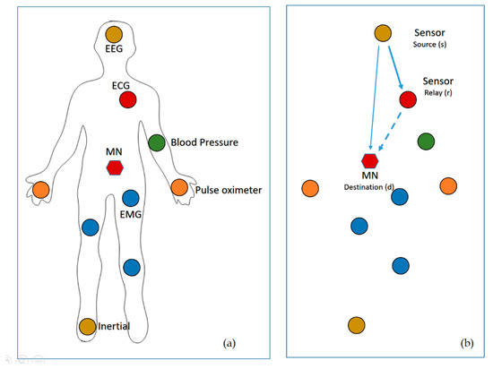 Figure 1a shows an example of a WBAN system. There are many sensors uniformly distributed around the body to monitor the patient’s health, and each sensor gathers data and sends it to the MN. In a WBAN that is based on the single-hop star topology, all the sensors send their data directly to the MN. The MN then directs the data to the monitor node, which either analyses it, or forwards it over the internet to the hospital or doctors.