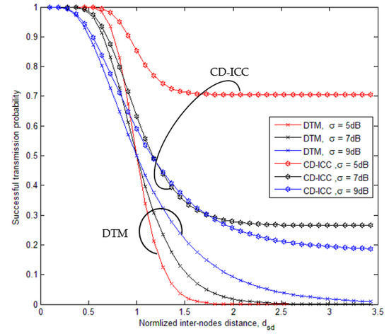 Comparison of successful transmission probability of DTM and CD-ICC with normalized inter-node distance, is 3.5, is , and is .