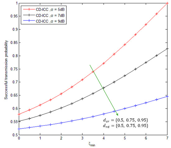 Successful transmission probability of CD-ICC with . In all cases, is , and is 3.5.