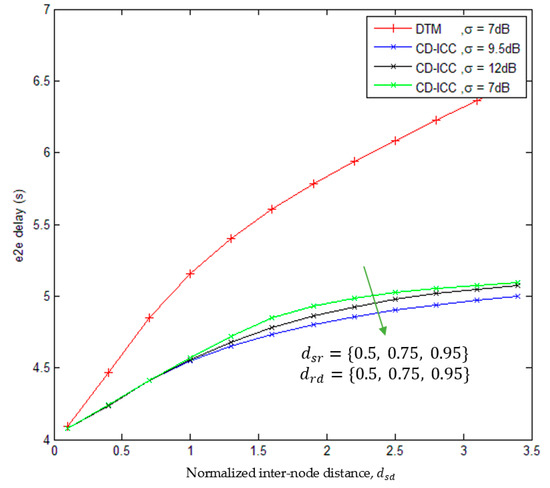 Comparison of e2e delay of DTM and CD-ICC with normalized inter-node distance, . In all cases, the is 3.5, is and is .
