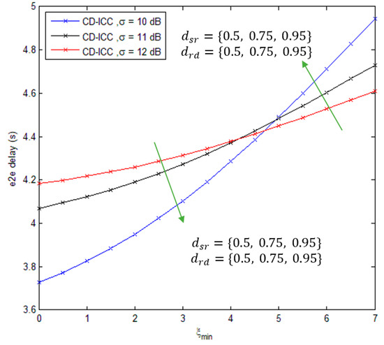 e2e delay of CD-ICC with . In all cases, is and is 3.5.