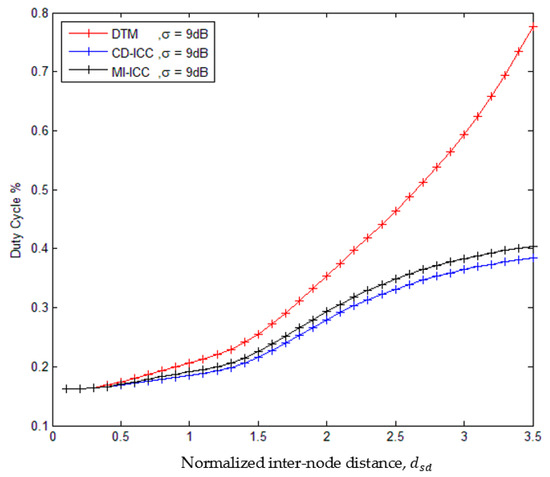 Comparison of Duty cycle of DTM, MI-ICC [34] and CD-ICC with normalized inter-node distance, . In all cases, the is 3.5, is , is and is .