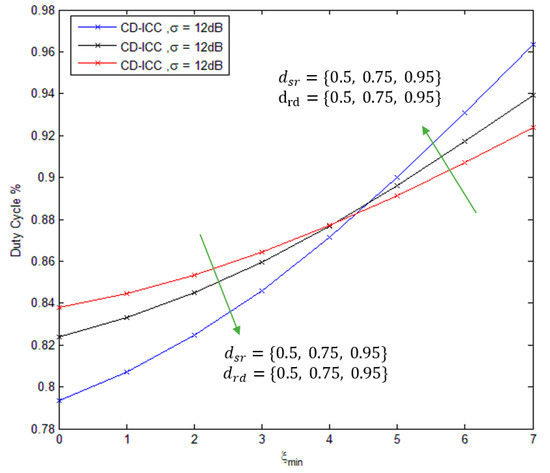 Duty cycle of CD-ICC with . In all cases, is , is , is and is 3.