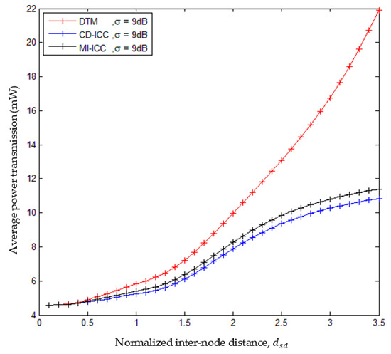 Comparison of average power transmission of DTM, MI-ICC and CD-ICC with normalized inter-node distance, .