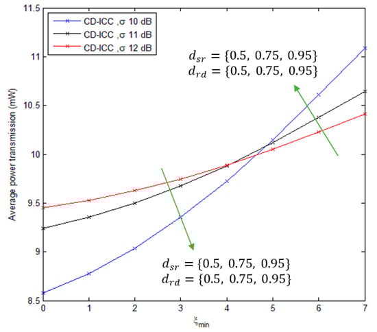 Average power transmission of CD-ICC with . In all cases, is , is and is 3.