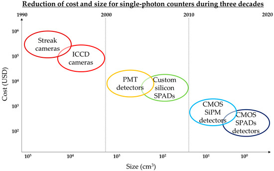 The main advances in reducing the cost and the size for instruments used for single-photon timing applications such as TR-DOS are achieved due to the recent developments in silicon photonics technologies [1,19]. Using technologies such as the complementary metal-oxide-semiconductor (CMOS) silicon technology simplify the implementation and the fabrication for the solid-state detectors [1,2,20]. These detectors, mainly SPADs and SiPMs, are much smaller and cheaper than sophisticated traditional photon timing equipment such as Streak cameras, ICCD cameras, and PMTs detectors as shown in Figure 1 [1,2].