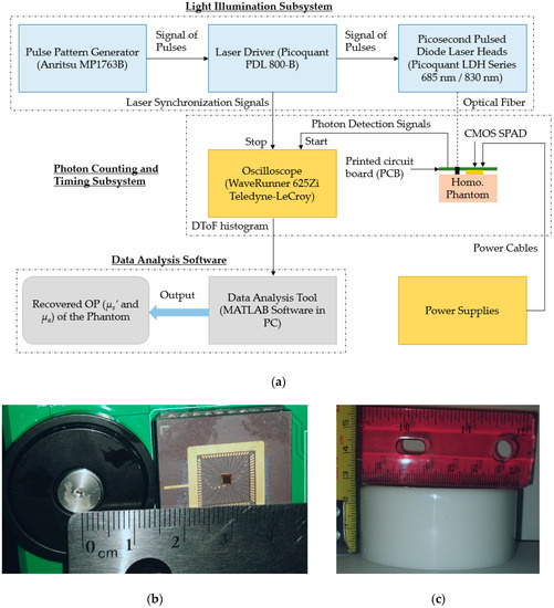 The re-emitted photons from a phantom are collected by our custom designed FR CMOS SPAD detectors (100 μm2 active area) in reflectance geometry [25]. In the excess voltages used (Vex = 1.2 V), our detector has short timing jitter (<150 ps), low dark count rate (DCR) ≈ 13 kHz at room temperature, and a photon detection efficiency (PDE) ≈ 0.6% at 685 nm and ≈ 0.2% at 830 nm [26]. Also, the dead-time of this detector is approximately 1 μs which allows for a maximum ≈ 0.5 million counts per second. The source to detector distance (SDD) between the fiber of the light source and the detector fixed at 28 mm, as shown in Figure 2b. The output signals of the FR CMOS SPAD and laser driver are connected to a Teledyne LeCroy oscilloscope (WaveRunner 625Zi, Teledyne LeCroy, Chestnut Ridge, NY, USA) to determine the delay between the edges of the two signals and record the photon time of arrival (PTA) for each detected photon [32]. Then, a DToF histogram can be performed by counting a reasonable number (~105) of re-emitted photons [6].