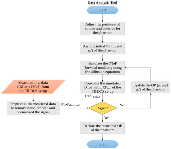 Flowchart of the data analysis process to recover the OP of the phantoms using the TR-DOS prototype.