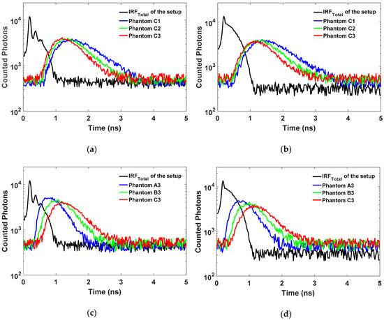 The narrowest FWHM of IRFTotal in each wavelength is less than 120 ps for low-power light (Figure 8a,b). However, we used a higher power to illuminate the phantoms, which is essential to eliminate the impact of the CMOS SPAD’s modest PDE and the small active area. At a higher power level, the width of pulses for the picosecond diode laser is increased significantly, which leads to broadening of the FWHM of IRFTotal of the TR-DOS setup [1,28]. Therefore, the temporal widths of IRFTotal are broadened to 120 ps and 350 ps using 685 nm and 830 nm laser sources, respectively. Figure 8 shows the IRFTotal that were measured at both wavelengths of 685 nm and 830 nm.