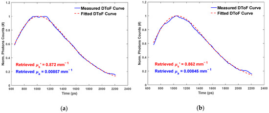 DToFMeasured curves and DToFFitted curves for B2 phantom with SDD = 2.8 cm: (a) at 685 nm; and (b) at 830 nm.