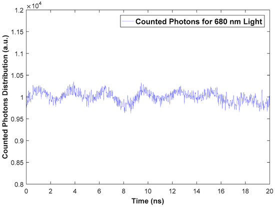 The εDNL was estimated to be 0.073 (7.3%) using Equation (1) and the measurement setup illustrated in Figure 4. This level of error is acceptable because the level of DNL error is normally several percents [36]. This result indicates that the oscilloscope performs time-to-digital conversion (for the counted photons) with a slight distortion of the width for time bins.