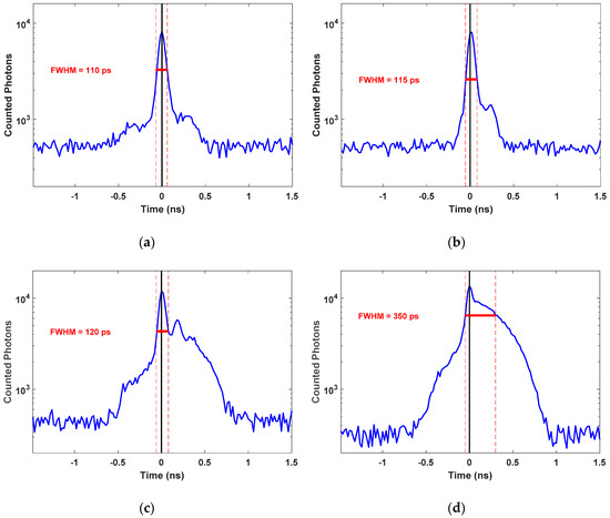 FWHM of IRFTotal of the TR-DOS prototype at two different wavelengths used in this work: (a) 685 nm at low optical power (0.05 mW); (b) 830 nm at low optical power (0.06 mW); (c) 685 nm at the used optical power (2.2 mW) to illuminate the phantoms; and (d) 830 nm at the used optical power (3.6 mW) to illuminate the phantoms.