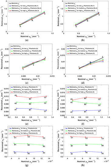 The TR-DOS prototype has presented good linearity for retrieving μs’ with some overestimation for all nine phantoms at both wavelengths Figure 9a,b. In addition, the prototype has shown good linearity for retrieving μa for phantoms B and C in both wavelengths with some underestimation at 830 nm Figure 9c,d. On the other hand, better linearity was obtained for the retrieved μa for low μa phantoms (1) versus high μa phantoms (2 and 3). This is a result of the reduction in the absorption-to-scattering coupling at both wavelengths Figure 9e,f. Also, the results show good linearity for the retrieved μs’ for all phantoms which indicates low scattering-to-absorption coupling (Figure 9g,h). Generally, the linearity of this TR-DOS prototype is very good and comparable to the reported linearity results in the literature [37,49,50,51,52].