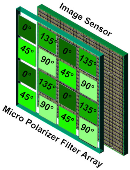 The PFA is composed of pixel-size linear polarizers oriented at four different angles (, , , and are the polarization orientations employed in most of the PFA cameras), superimposed on a camera sensor chip, as shown in Figure 1. In front of the sensor, the PFA samples the polarization direction by filtering the incoming irradiance according to polarizer angles. Therefore, each pixel measures the intensity coming from only 1 of the 4 different polarizers. Some PFA cameras appear on the market, like the Polarcam device from 4D Technology [24], and more recently, the IMX250MZR polarization-dedicated sensor from SONY (Tokyo, Japan). Both PFA use the same filter arrangement that is described in Figure 1. But the SONY sensor that comes in 2018 is particularly cheap, and holds the polarization matrix bellow the lens array, which limits the cross-talk effect in adjacent pixels [6]. Moreover, as it was previously done for other computational imaging [25,26] and computer vision [27] algorithms, Lapray et al. [2] have recently proposed an implementation of a real-time polarization imaging pipeline using an FPGA.