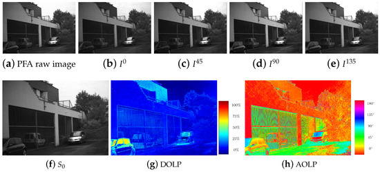 Polarization Filter Array (PFA) imaging overview. (a) Raw output image from the 4D Technology camera. (b–e) Downscaled polarization images (without spatial interpolation). (f–h) Polarization descriptor images associated to downsampled images.