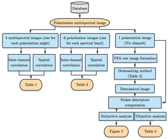 The purpose of this paper is to first study the correlation properties of polarization channels and their similarities with those of spectral channels. Then to review some existing interpolation strategies dedicated to filter array imaging, i.e., CFA, SFA, and PFA. Finally, we propose to evaluate objectively the methods and those we have adapted to the PFA case, in the special context of PFA. A diagram of the proposed analysis is shown in Figure 3. We organize the paper as follows. First, a data correlation study across the polarization channels is presented in Section 2. Next, different CFA, SFA, and PFA interpolation techniques are presented in Section 3. Results and discussion of the surveyed methods is proposed in Section 4. The paper ends with several conclusions in Section 5.