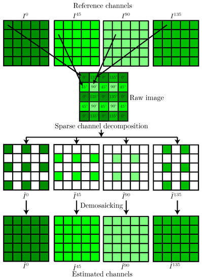 A PFA camera provides a raw image with pixels, in which a single polarization angle is available at each pixel p according to the PFA arrangement. Let S be the set of all pixels (with a cardinal of ) and be the pixel subset where the PFA samples the angle k, such that . A PFA can be defined as a function that associates to each pixel p its polarization angle. Therefore the pixel subset where the PFA samples the polarization angle k can be defined as . The raw image can then be seen as a sampled version of the fully-defined reference image (that is unavailable in practice) according to the PFA: