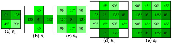 The five demosaicking kernels of the five bilinear methods from the work by Ratliff et al. [34]. It refers to the neighborhood used for interpolation. (a–c) Are simple bilinear kernels, whereas (d,e) are weighted bilinear kernels.