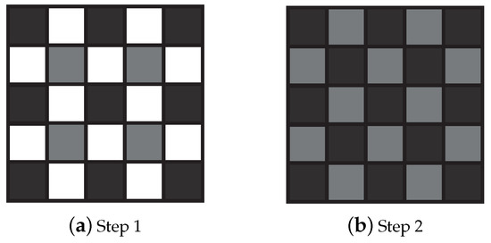 Neighborhood used for weight computation in any channel according to the step of binary-three edge sensing (BTES) algorithm. Pixels in black are known or previously estimated, whereas pixels in gray are the estimated pixels. Pixels in white are unknown and not estimated at the current step.
