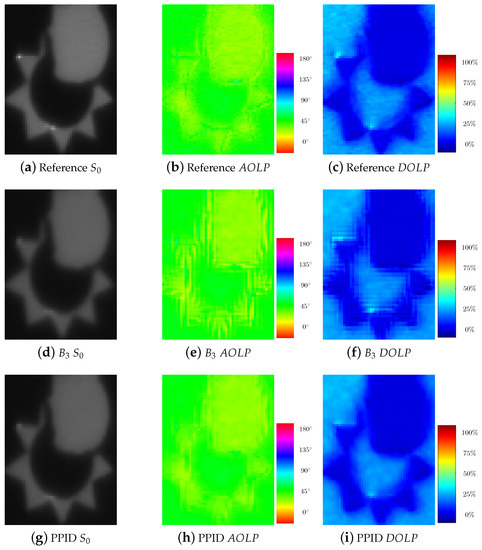 For tested SFA-oriented methods, the use of spectral correlation generally provides better performance than simple bilinear interpolations. Moreover, methods based on gradient computation (BTES, MLDI, and PPID) exhibit the best demosaicking performances. By considering the PPI as a guide for demosaicking, PPID shows the best demosaicking performances among all methods for all polarization channels, also for , parameters and descriptors.