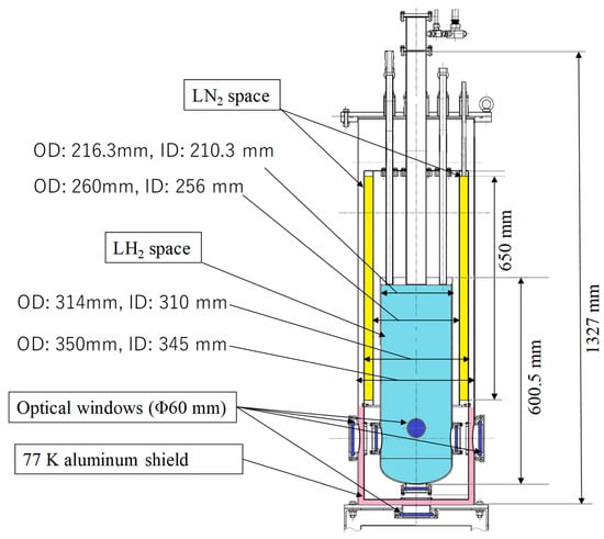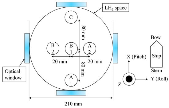 Figure 2 shows a schematic diagram of the LH2 optical cryostat (small LH2 tank), which comprises a vacuum jacket, an LH2 space (20 L), a liquid nitrogen (LN2) space (15 L), a 77 K aluminum shield, and five optical windows. The optical cryostat is 1327 mm tall, and the optical windows are made of Pyrex glass and have an effective diameter of 60 mm. The natural heat-input power to the LH2 space was found experimentally to be roughly 0.72 W, and that to the LN2 space was roughly 5.8 W when all optical windows were covered with aluminum caps. Figure 3 shows the layout of the five MgB2 level sensors. The bow direction of the ship was equal to the pitch direction, as shown in Figure 3. Sensors B2 and A2 were positioned to detect the liquid-surface oscillation in the roll direction, A1 and C were positioned to detect the liquid-surface oscillation in the pitch direction, and B1 was positioned to detect the liquid-surface oscillation at the center of the small LH2 tank. In addition, all five sensors were fixed with a stainless steel plate and the glass fiber-reinforced plastics (GFRP) rod.
